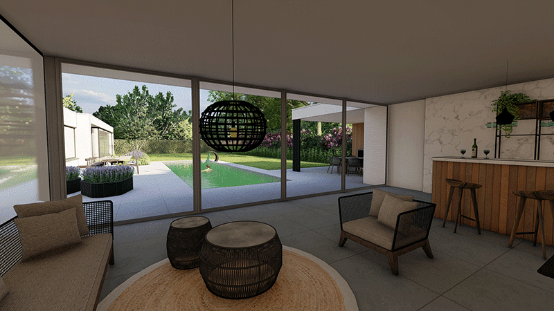 Naast het zwembad hebben onze architecten een prachtig modern poolhouse ingetekend in het ontwerp. Met grote ramen, een bar en loungemeubilair is dit poolhouse de ideale plek om na het zwemmen te genieten van een verfrissend drankje. Doordat het poolhouse volledig afgesloten kan worden, is het ook een ideale plek om ‘s winters van de tuin te genieten. Het uiterlijk van het poolhouse sluit perfect aan op het ontwerp van de woning. Onder de overkapping hebben we een prachtige buitenkeuken gepland, waar de eigenaars op zomerse avonden heerlijke diners kunnen bereiden.