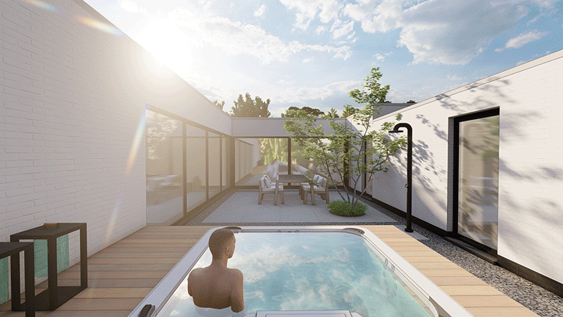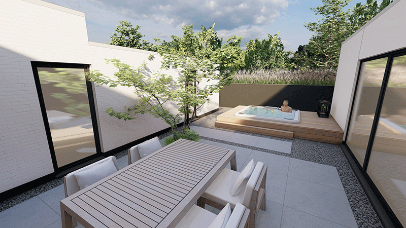 Voor ultiem comfort hebben we in de patio een wellness-ruimte ontworpen. Onze ontwerpers hebben op deze plek onder andere een heerlijk spa-bad bedacht. Deze ligt verzonken in een houten vlonder. Ook staat in deze patio een tuintafel met luxe tuinstoelen, waar men heerlijk kan ontspannen in de beschutting en privacy van de woning.