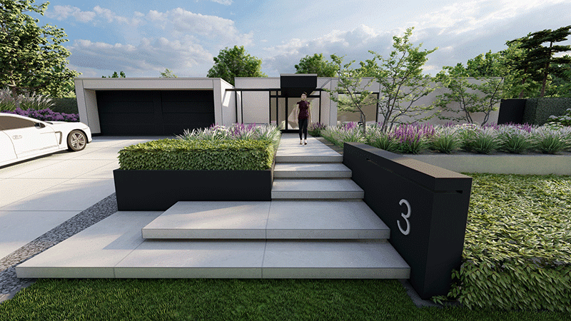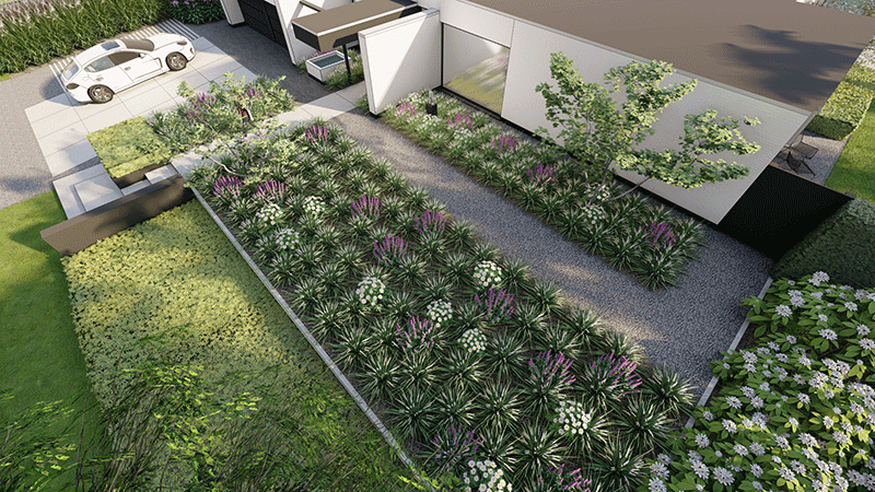 Het nieuwe tuinontwerp is onderdeel van een grootscheepse renovatie van de onlangs aangekochte jaren ‘60-woning. Onze tuinarchitecten ontwierpen een volledig nieuwe voor- en achtertuin en zette de schetsen om in realistische 3D-impressies. Zo weten onze klanten precies hoe hun toekomstige tuin eruit komt te zien.
