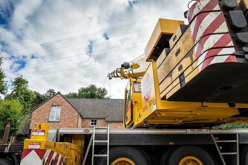 Doordat de achtertuin geen toegangsweg heeft, was het perceel niet bereikbaar voor grote machines, wat de grondwerken en ook het aanleggen van het zwembad aanzienlijk bemoeilijkte. Om de benodigde materialen en machines aan te leveren en de oude ondergrond af te voeren, gebruikten we daarom een tientallen meters hoge kraan die de materialen en machines (waaronder een graafmachine) over het huis heen kon takelen.