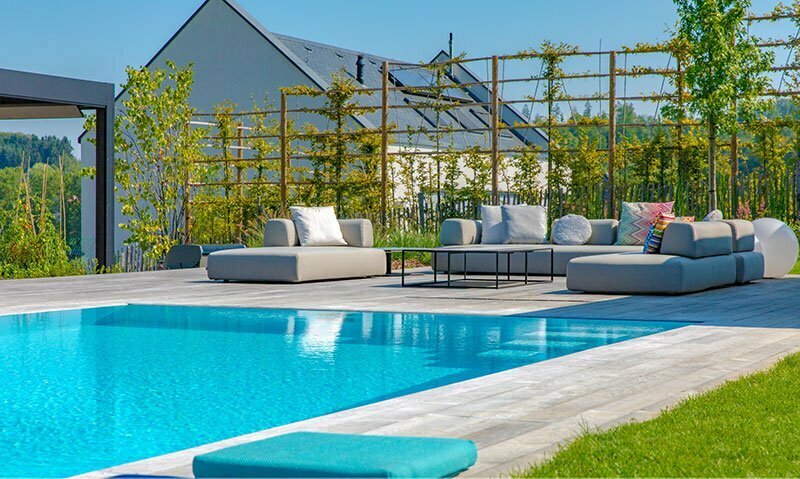 ZwemParels is weliswaar een aparte afdeling, maar ze werkt wel nauw samen met de tuinontwerpers. Zodat de perfecte harmonie ontstaat tussen zwembad, terras, bomen, gazon, planten en waterpartijen. Het lijkt wel synchroonzwemmen. Een buitendouche, een maatwerk sauna, een jacuzzi? Het kan allemaal. Prachtig meubilair, van vooraanstaande merken, maakt het plaatje ‘ daar aan die waterkant’ helemaal af. De juiste, sfeervolle verlichting laat je toe om ook een nachtelijke duik te nemen. Kan het nog romantischer! Koudwatervrees? Je kiest na deskundig advies zelf hoe je de inhoud van de pool wilt verwarmen. De aangeboden afdeksystemen kunnen daarin een rol spelen. Als je gebruik maakt van de onderhoudsservice, moet je na een zwempartij alleen nog maar inzitten over je natte haren, nier meer over rimpels aan het wateroppervlak. En hoewel het zwemseizoen eigenlijk nooit hoeft te eindigen, kan je alle accessoires, zetels en speelgoed desgewenst toch opbergen in poolhouse, dat mooi geïntegreerd wordt in het geheel. En het allerleukste is: wie nu snel reageert, kan mogelijk al in het najaar zijn eerste baantjes trekken.